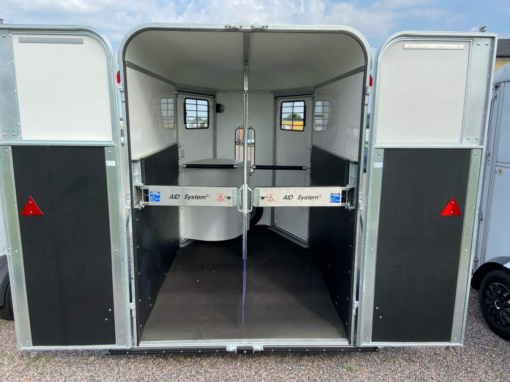 Provan Premium – utrustad som Classic men Du får även AID SYSTEM istället för ”säker urlastning” som innebär att du kan öppna och stänga bakom hästen framifrån. Du får även en extra framdörr samt 2 st öppningsbara fönster med galler och snygga fälgsidor.